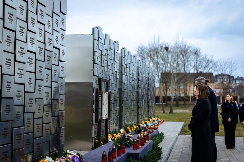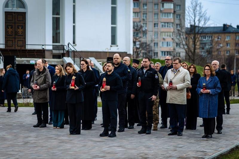 Tego samego dnia do Buczy przyjechali również ministrowie spraw zagranicznych państw UE, m.in. z szefową unijnej dyplomacji Kają Kallas, szefem MSZ Ukrainy Andrijem Sybihą oraz komisarzem UE ds. obrony i kosmosu Andriusem Kubiliusem. Delegacja złożyła znicze pod pomnikiem ofiar i odwiedziła cerkiew z wystawą dokumentującą rosyjskie zbrodnie.