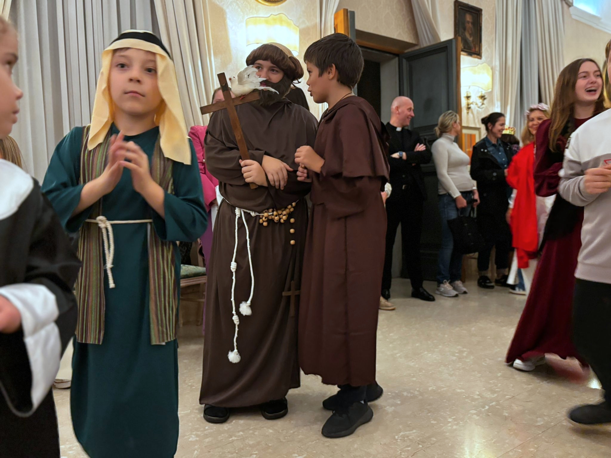 Po Mszy św. wszystkie przebrane za świętych osoby korowodem przeszły do auli Jana Pawła II. To tam nastąpiło rozstrzygnięcie konkursu plastycznego „Święty Zwycięża”. Prace zgłosiło 87 dzieci z Polskich Szkół w Rzymie. „Dziękuję rodzicom i nauczycielom, że troszczą się  o radosne przeżywanie świętości dzieci i młodzieży. Bo świętość może towarzyszyć nam każdego dnia, w zwyczajnych sytuacjach” – zaznaczył rektor Kościoła św. Stanisława BM w Rzymie, duszpasterz polskiej emigracji, ks. dr Paweł Ptasznik.